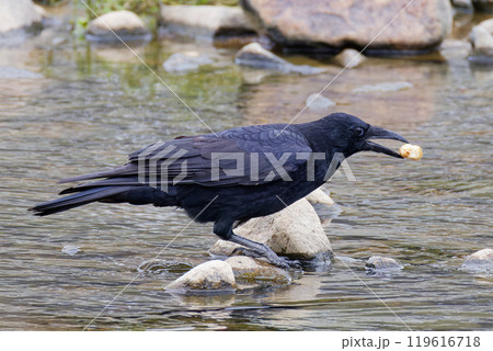 川で食事中のハシボソガラス