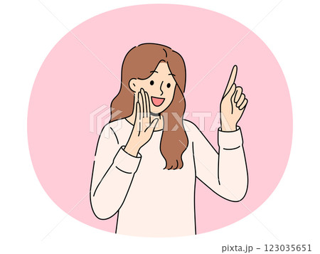 Woman tells secret by putting palm to mouth and pointing finger up recommend paying attention to ads