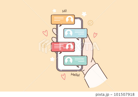 Mobile phone with messages in hands of person using social networks to correspond with friends