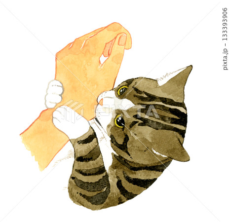 人の手に嚙みついているキジ白猫 手描き水彩イラスト素材
