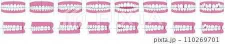 歯並び、歯列の不正咬合の種類。正面と横のベクターイラスト