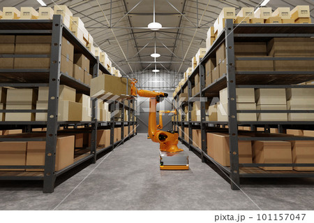 Warehouse, automatic robots, loading and unloading of boxes and goods, artificial intelligence, logistics. Robots sort and move boxes. technologies of future
