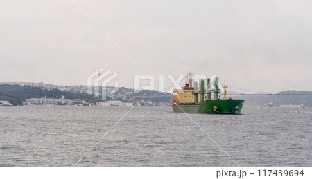 A cargo ship navigates the Bosphorus near Istanbul's coastline, showcasing the blend of maritime trade and cityscapes. Perfect for shipping and global trade content