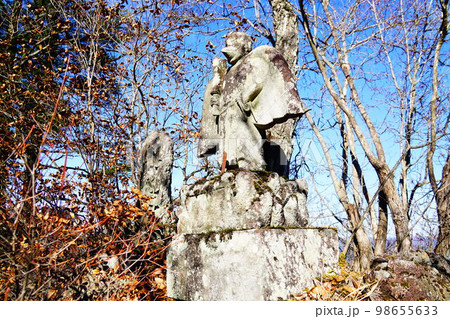 西上州・四ツ又山山頂の石像と妙義山の岩峰