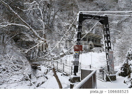 雪に覆われた真冬の袋田の滝の吊り橋
