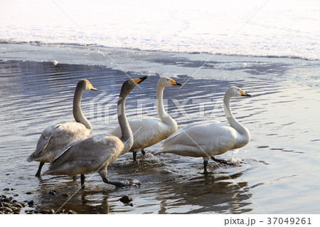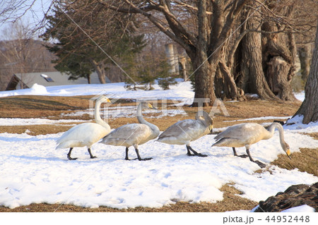 北海道屈斜路湖、水際の四羽の白鳥、三月の屈斜路湖