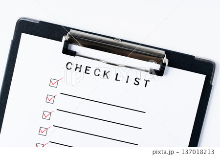 赤いペンでレ点を記入したバインダーに挟んだチェックリストの紙