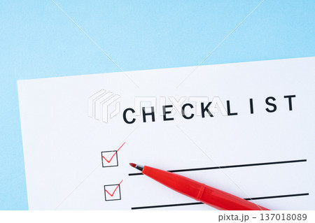 水色の背景に赤いペンでチェックをしたチェックリストの紙