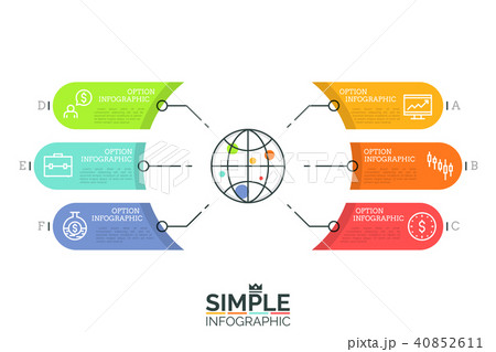 Globe surrounded by 6 colorful elements with place for text and thin line pictograms. Global