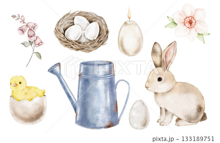 Watercolor Easter clipart set including a rabbit, nest with eggs, flowers, metal jug, chick, and decorative elements. Perfect for cards, posters, packaging, crafts, and seasonal design compositions.