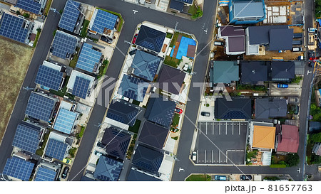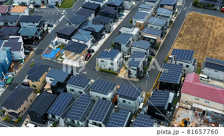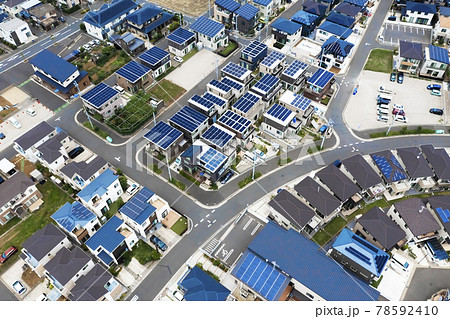 ソーラーパネルの設置された住宅地 空撮