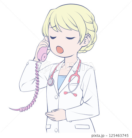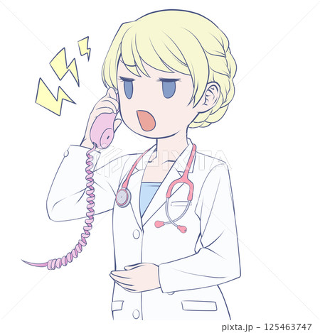 受話器を持って話す黒髪の女性医師・呼び出し中