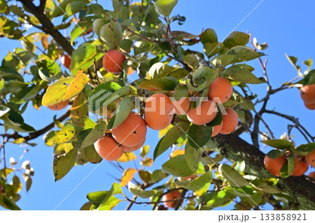 雪が積もった枝に実る柿(カキノキ科)落葉小高木