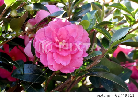 三鷹中原に咲くピンクのツバキ(カンツバキ)の花
