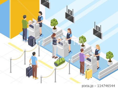 Isometric airport baggage tape and check in service. Passengers registration plane process. People with suitcases waiting, flawless vector scene