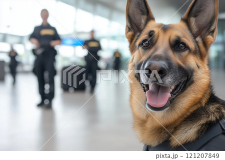 detection dog against the background of customs officers in an airport building