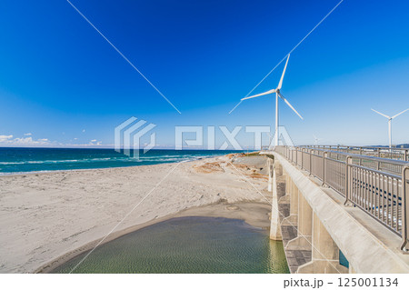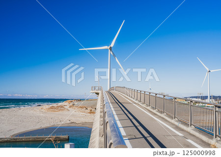 掛川市にある青空に映える国安海岸と潮騒橋と風力発電の風景(静岡県)