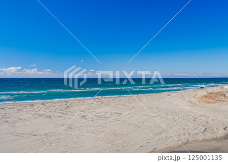 掛川市にある青空に映える国安海岸と海と空の風景(静岡県)