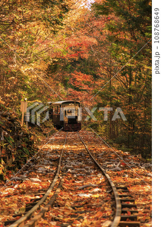 紅葉の中を走る赤沢自然休養林のトロッコ列車 長野県・上松町