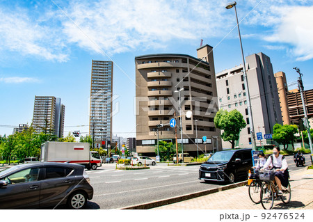 国道2号線の広島市役所南交差点風景です。ビジネスビルやマンションが林立しています。混雑路線です。