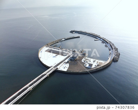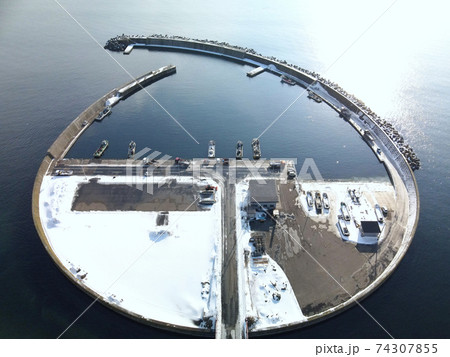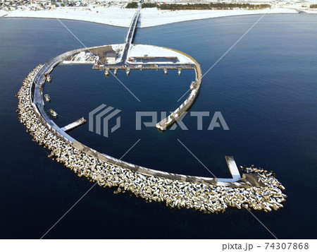 冬の北海道長万部町国縫漁港の雪景色を空撮
