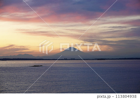 夕暮れ時 内房の砂浜から見た東京湾に浮かぶ富士のシルエット