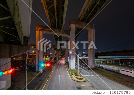 夜の国道と都市高速道路の立体交差(福岡県北九州市)