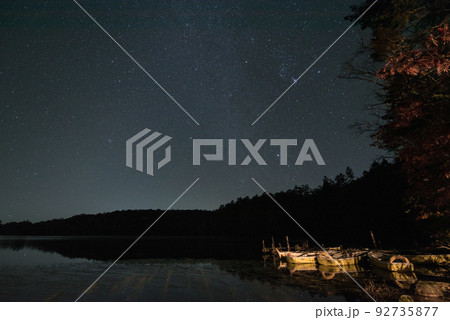 長野県南佐久郡の北八ヶ岳のメルヘン街道沿いの白駒池/白駒の森の星と星空のリフレクションと小舟