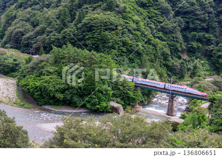 深緑に包まれた仙岩峠の渓谷を走り抜ける秋田新幹線