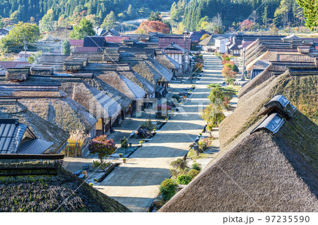 福島県南会津郡 伝統的な茅葺屋根の建物が並ぶ有名な観光地「大内宿」