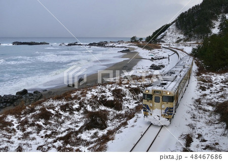 青森県 深浦町の驫木駅を出発した気動車
