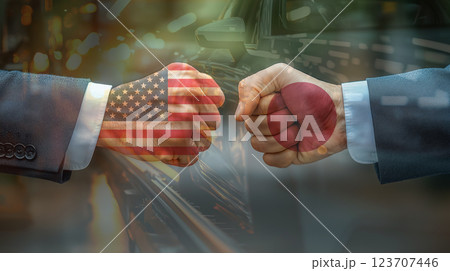 ビジネスと経済交渉の力強いコンセプト。自動車輸出入産業における貿易摩擦のイメージ