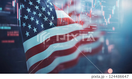 アメリカ国旗と重なるデジタル経済と市場データのグラフィック