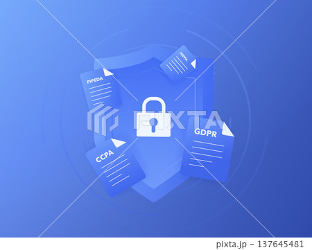 Data privacy regulations compliance, GDPR CCPA HIPAA PIPEDA protection, global personal information security framework, corporate data governance shield, modern flat design, vector illustration