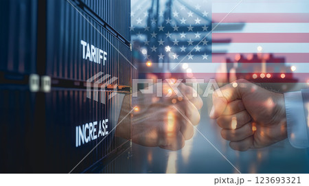 港湾シーンにまたがる世界的物流と金融取引のシンボル、中米貿易関係を強調