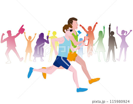 視覚障害者がマラソン大会を走っているイラスト素材です。ガイドランナーが伴走しています。