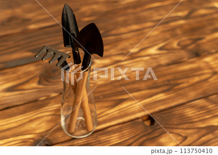 Close-up of gardening tools, potted plants and soil scattered on floor during repotting plant process. Concept of home gardening, and spring houseplant care