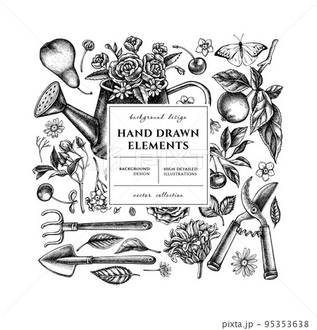 Gardening hand drawn illustration design. Background with retro watering can, apples, cherry, rose, pears, shovel, rake, secateurs, chamomile, sunflower, forget me not flower, ranunculus, great orange