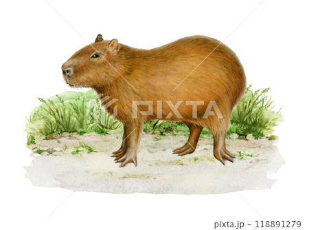 Capybara animal on the grassy ground painted illustration. Vintage style hand drawn Hydrochoerus hydrochaeris South America native wildlife mammal. Cute capybara standing on white background