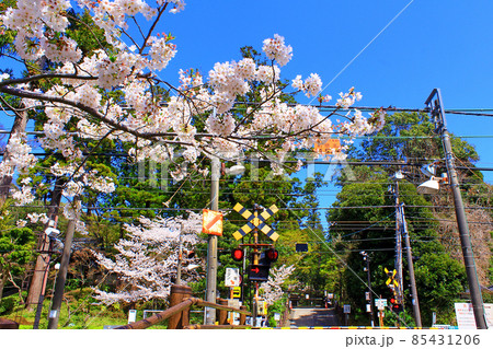 【神奈川】春の鎌倉 円覚寺白鷺池の畔から望む桜と踏切