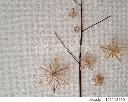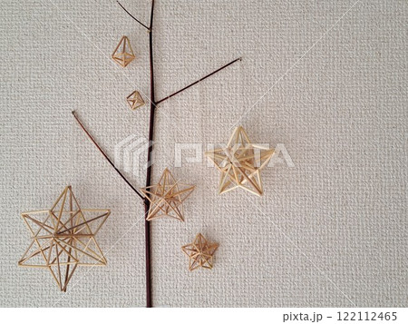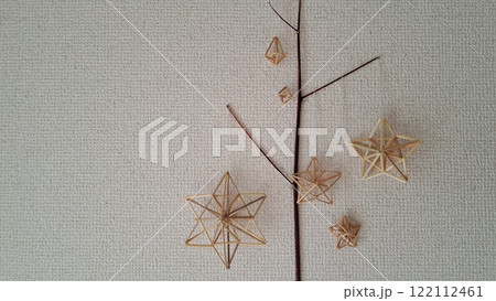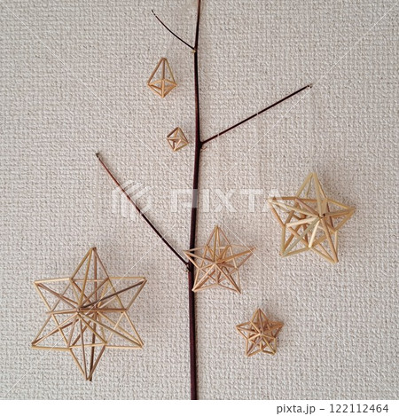 自然なライ麦の藁で手作りした北欧の手仕事ヒンメリを木の枝にレイアウト