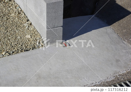 Flowers and gardening tools in a flowerbed in the backyard garden