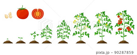 Tomato growth stage, vegetable plant grow cycle of agriculture seedling. Cultivation tomato process vector phases from seed to sprout, garden vegetables crop and farm harvest