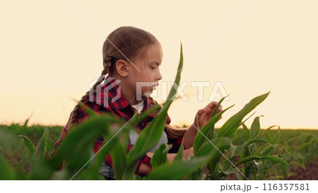 agriculture, child kid daughter farmer girl touches green corn leaves sunset, little child touches corn leaf with hand field, fertile soil, family business happy family, girl touches corn sprout leaf