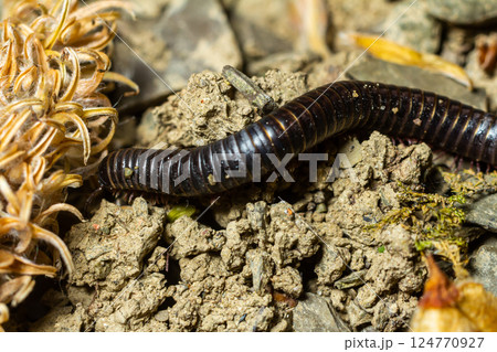 Detailed view of a black millipede crawling on gravel soil near dried vegetation in a natural setting during daylight