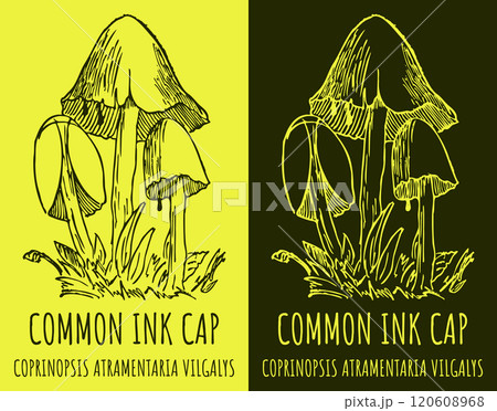 Vector drawings COMMON INK CAP. Hand drawn illustration. Latin name COPRINOPSIS ATRAMENTARIA .