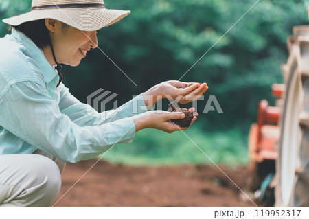 土を見る女性農家