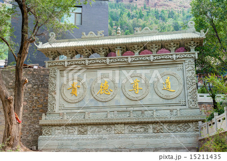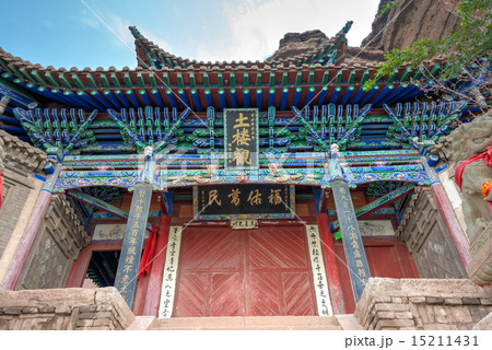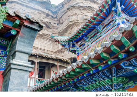 中国 青海省 西寧市北山に建つ道教寺院・北禅寺と背後の断崖風景、寺院、寺、道教、道教寺院、道観、北禅
