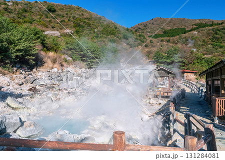 Hell valley Jigoku at Mount Unzen onsen in spring, Nagasaki, Japan