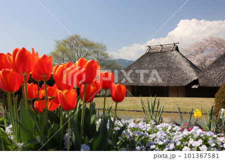 茅葺き屋根の古民家とチューリップ